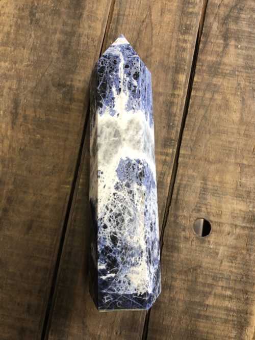 Beautiful large Sodalite tower. A gorgeous natural imprint of angel wings right in the middle. Sodalite is a stone of communication, often used to open up the throat chakra. Do not be shocked if your ability to channel are activated with this in your space. Sodalite brings clarity and promotes truth in all situations. Sodalite is a calming stone and popular in many healing spaces.